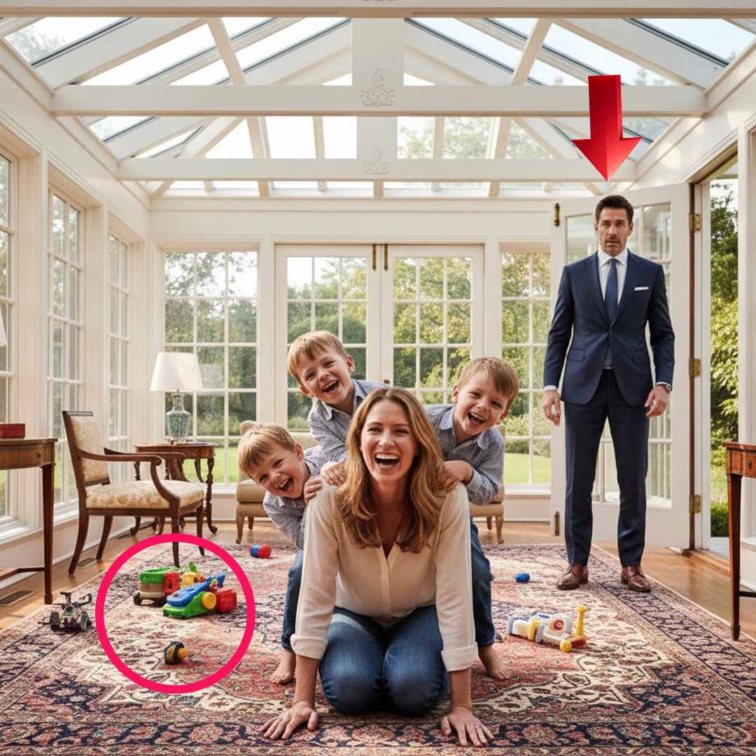 She froze mid-motion, hands gripping the carpet, her eyes widening in sheer panic. Her breath caught, the playful energy instantly sucked out of the room. The boys, lost in their own world of fun, didn’t notice right away. They were too busy laughing, too vibrantly alive to see the man who stood like a grim statue in the doorway, a ghost in his own home.