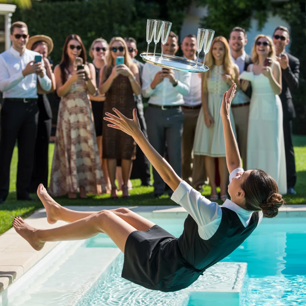 Izzy was off balance, her work shoes offering no grip on the slick marble. The tray of empty glasses went flying, a brief, chaotic constellation of crystal before it crashed onto the patio. Izzy’s arms flailed for a desperate moment, a silent plea for purchase in the empty air. Then she fell backward into the pool.