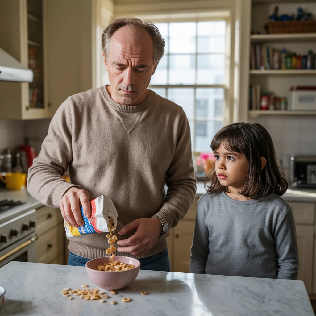 Ethan blinked, looking down to find cereal overflowing onto the marble counter.