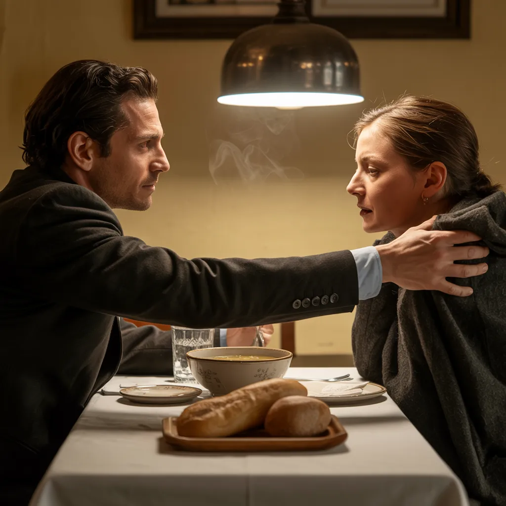 She lifted the spoon, her hand shaking so badly she nearly spilled it. They ate in silence. Dominic finally spoke, his voice low and tired.